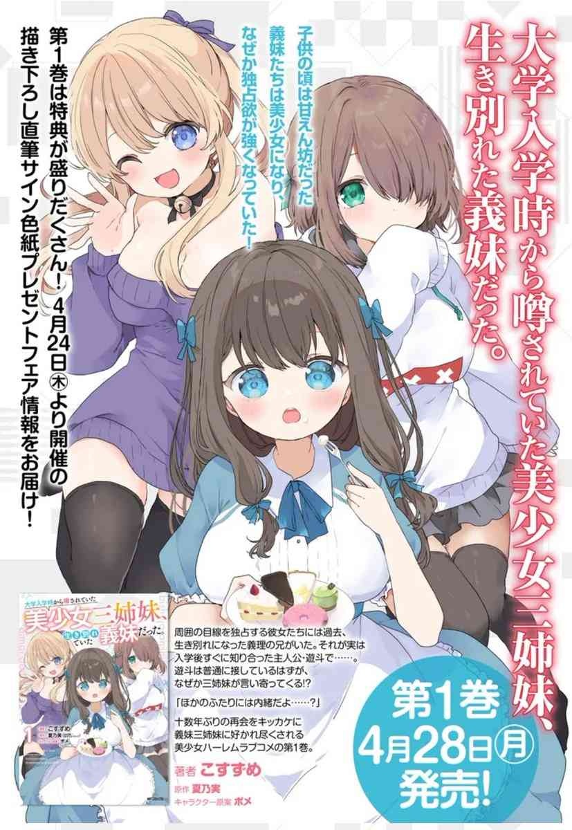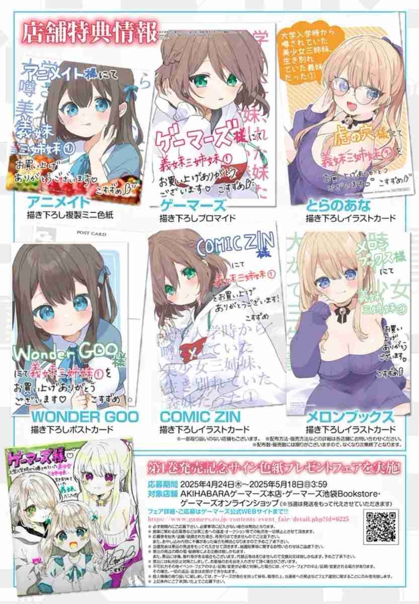 - コミカライズ 大学入学時から噂されていた美少女三姉妹、生き別れていた義妹だった1巻 「義妹三姉妹に好かれ尽くされるハーレムラブコメ!」