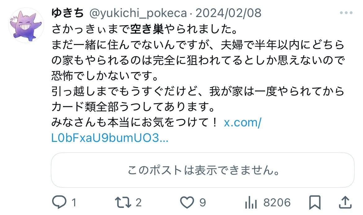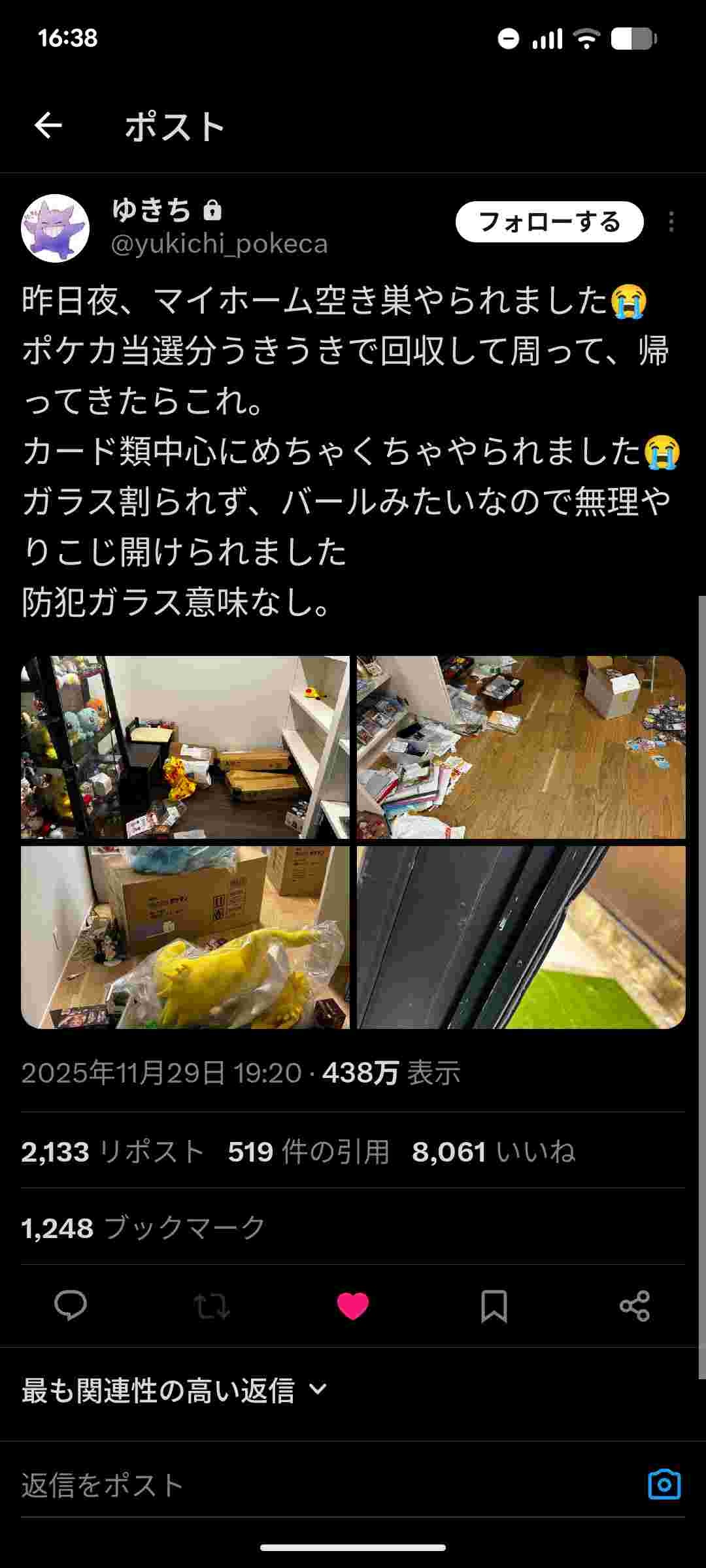 ポケカオタクさん、Xで自慢しまくったコレクションを根こそぎ空き巣されてしまうwww