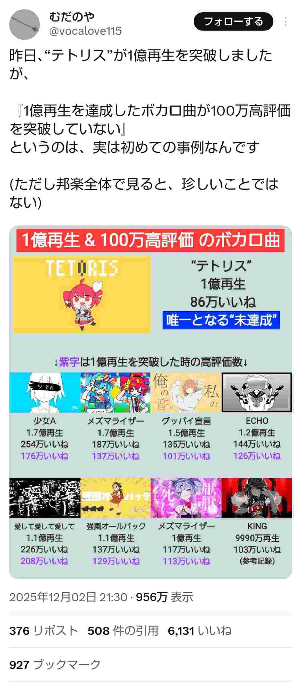 ボカロオタ「YouTube1億再生を達成したボカロ曲が100万高評価を突破していないのは"テトリス"が初めて」⬅なんで?