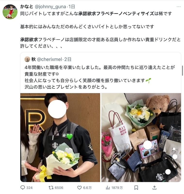 大学生「スタバのバイトを卒業しました!本当に楽しい毎日でした!」なぜか引用ツイートで噛みつかれる…