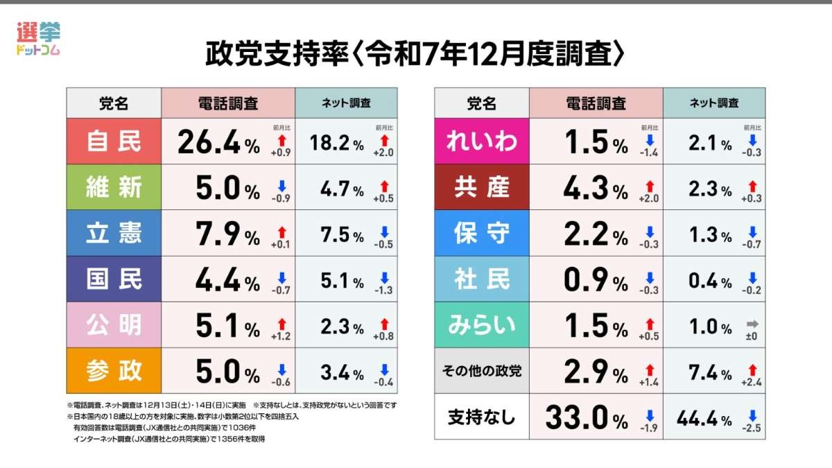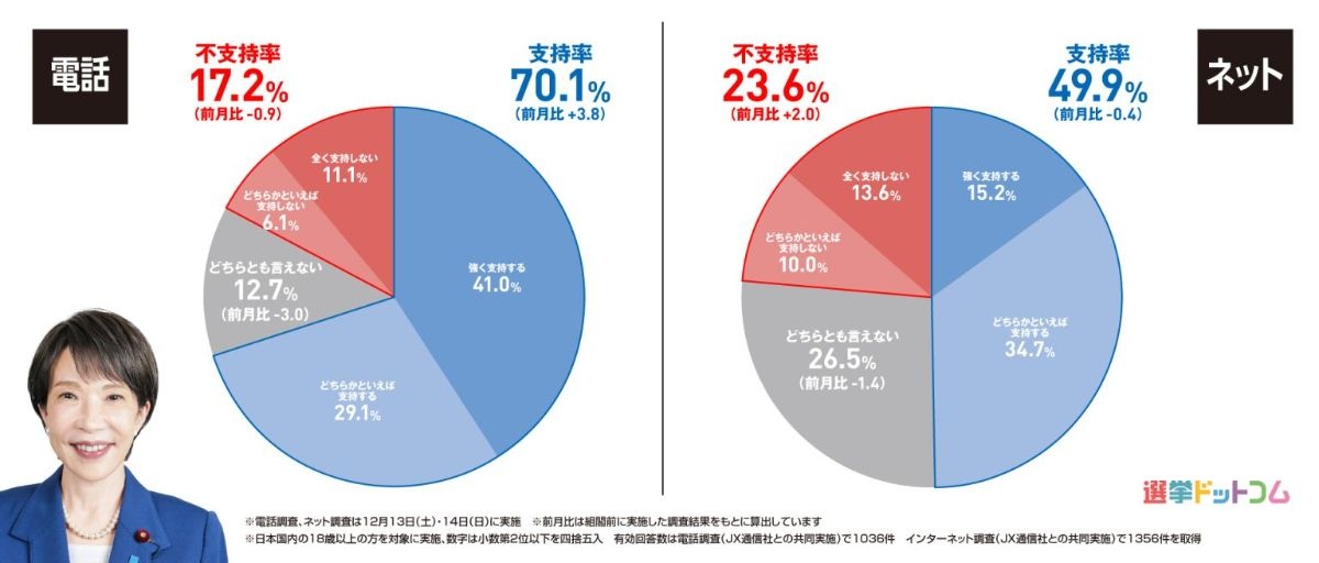 【速報】高市内閣支持率7割に上昇!政党支持で野党の順位が変動!?2025年12月電話×ネット意識調査(選挙ドットコム×JX通信社)