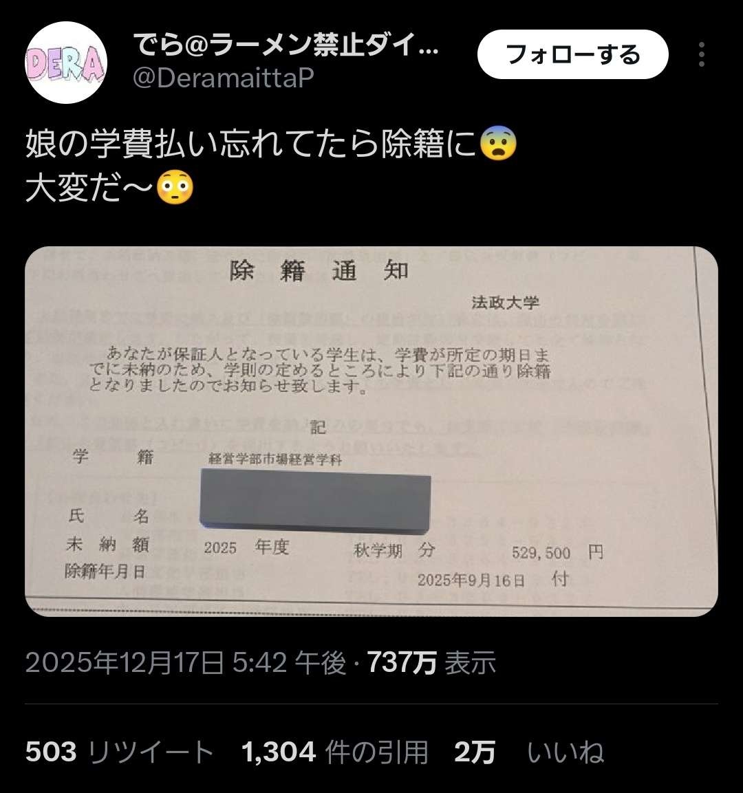 まんさん「娘の学費払い忘れてたら除籍に😨大変だ~😳(原文ママ)」