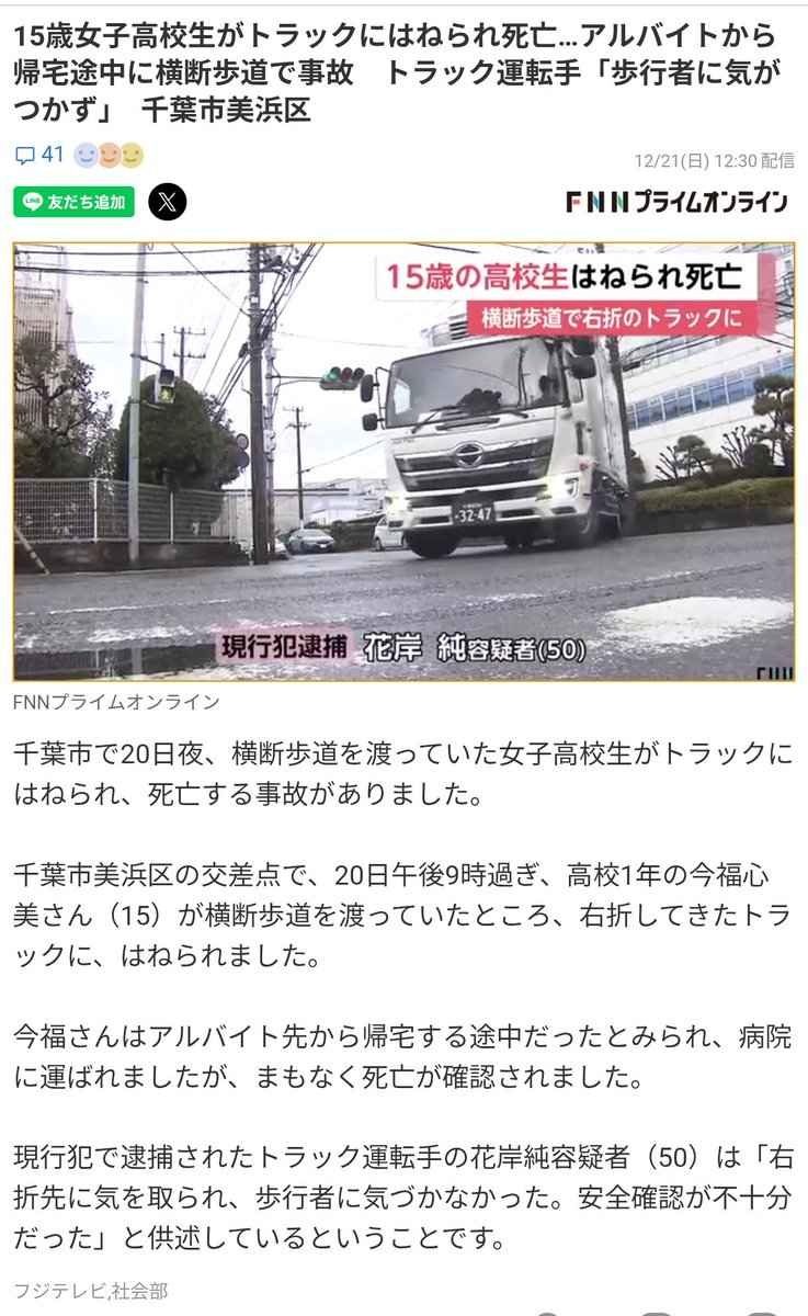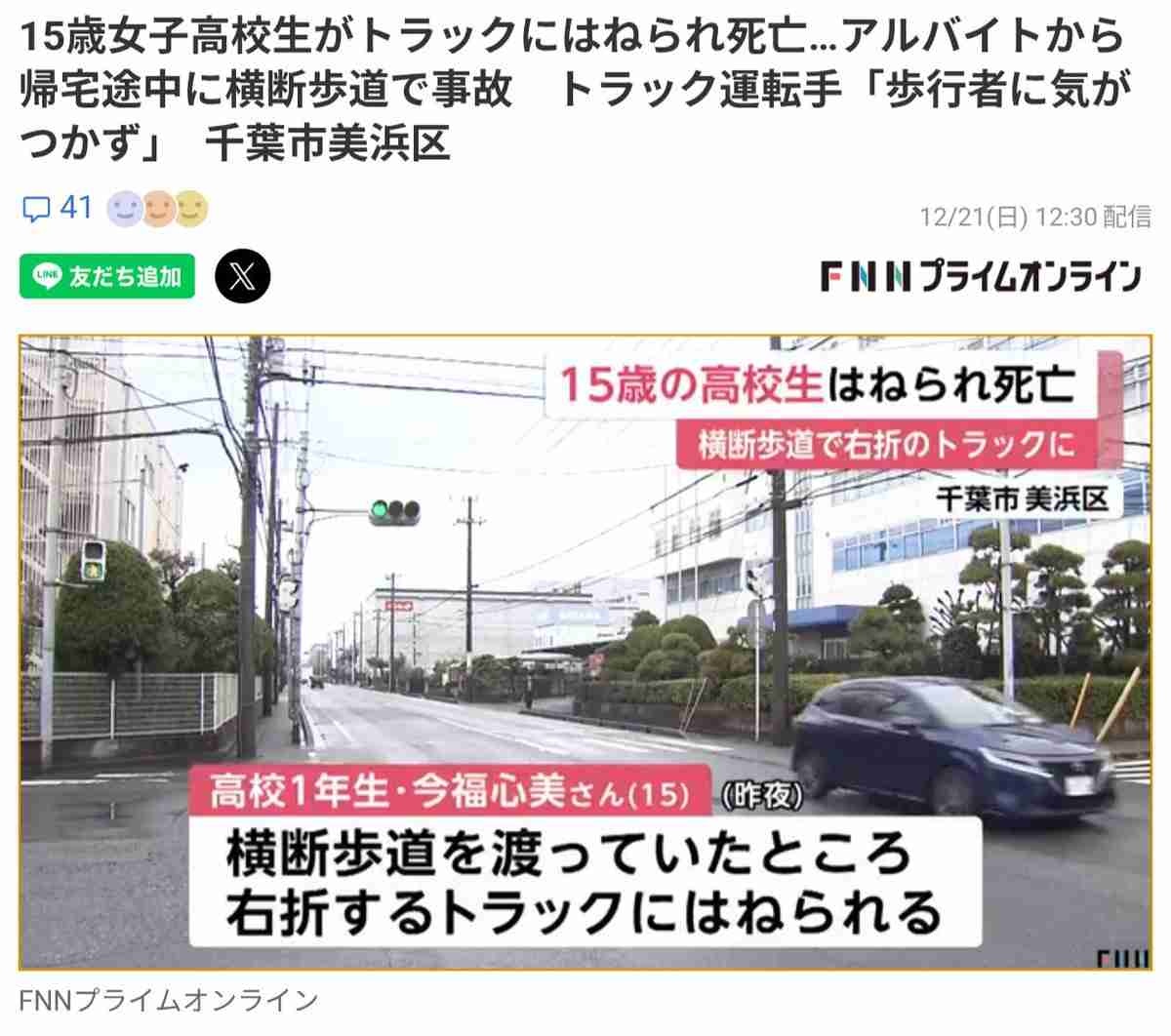 15歳女子高校生がトラックにはねられ死亡…アルバイトから帰宅途中に横断歩道で事故 トラック運転手「歩行者に気がつかず」 千葉市美浜区(FNNプライムオンライン(フジテレビ系)) – Yahoo!ニュース