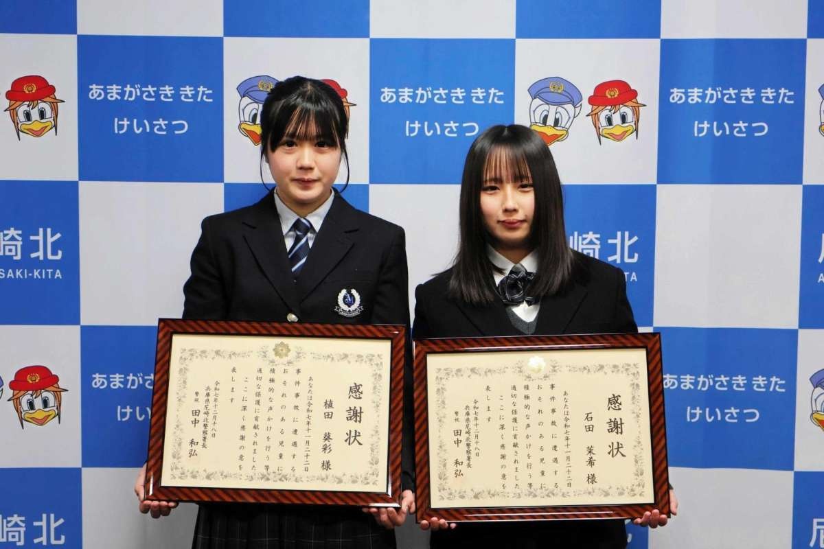 感謝状を受けた植田さんは「困っている人がいたら、積極的に声をかけて助けたい」とにっこり。将来は心理カウンセラーになりたいという石田さんは「これからも人に寄り添うことを大切にしたい」と話した。