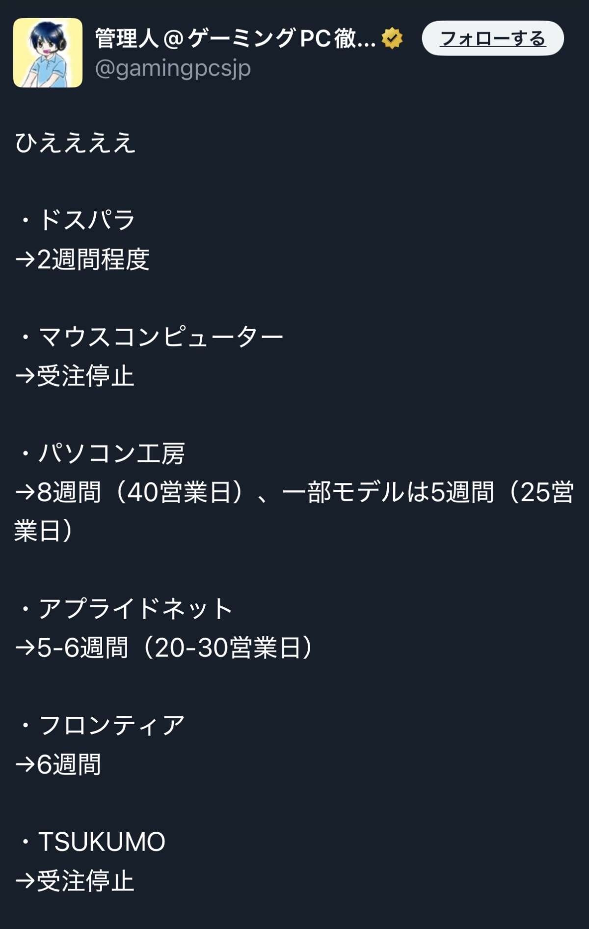 BTOゲームパソコン納期一線を越える。今買っても平均40営業日待ちで3月まで到着しない模様