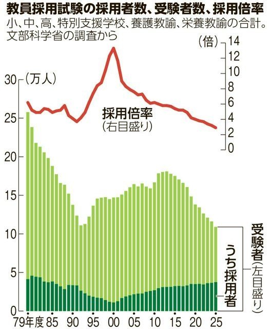 教員採用試験の倍率が過去最低2.9倍、受験者数も最少の11万人弱