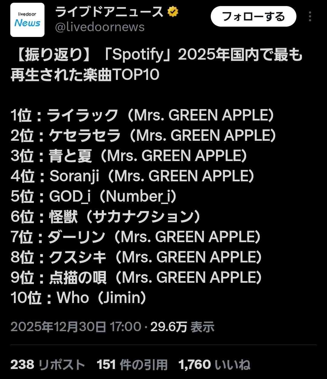 それぞれのミュージシャンの再生回数を見れば信用性と妥当性のないものだと普通は理解できる◯◯ってミュージシャンは消えたなとか言ってるけど完全にズレてる