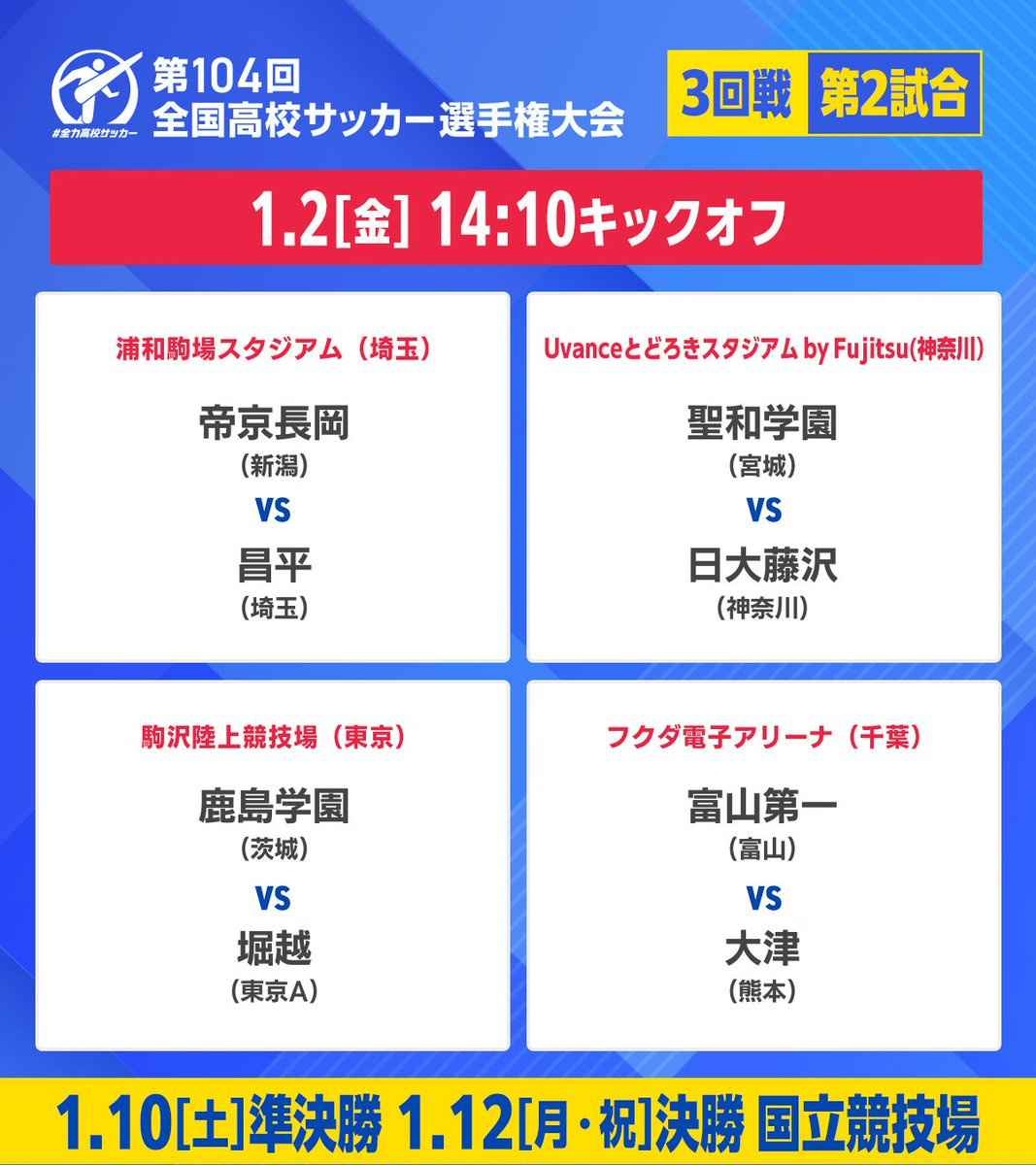 1月2日、第104回全国高校サッカー選手権の3回戦が首都圏内の4会場で行われる。