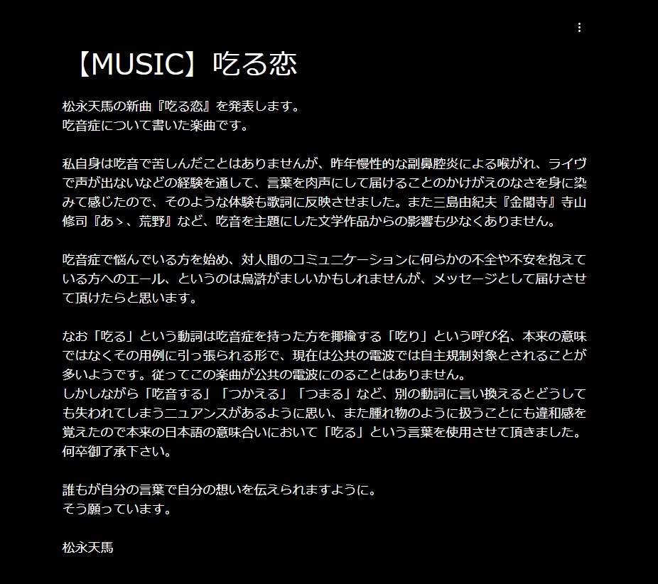 14日リリースのソロアルバム「黒一点」の収録曲でもある同楽曲の配信開始にともない、松永は「私自身は吃音で苦しんだことはありませんが、昨年慢性的な副鼻腔炎による喉がれ、ライヴで声が出ないなどの経験を通して、言葉を肉声にして届けることのかけがえのなさを身に染みて感じたので、そのような体験も歌詞に反映させました。また三島由紀夫『金閣寺』寺山修司『あゝ、荒野』など、吃音を主題にした文学作品からの影響も少なくありません」と歌詞制作の経緯を説明。