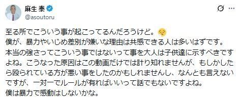 麻生氏は4日、当該動画について「至る所でこういう事が起こってるんだろうけど。僕が、暴力やいじめ差別が嫌いな理由は共感できる人は多いはずです」と切り出し、