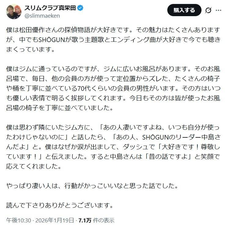 お笑いコンビ、スリムクラブの真栄田賢(49)が20日までにX(旧ツイッター)を更新。故・松田優作さん主演ドラマ「探偵物語」の主題歌「Bad City」などで知られる伝説的ロックバンド、SHOGUNの元メンバーにまつわる出来事についてつづった。