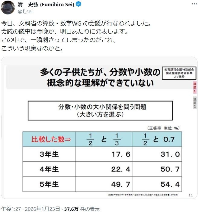 【学力が高市】 日本の小学生の約半数が「1/2と1/3、大きい方はどっち?」の問いに正解できない