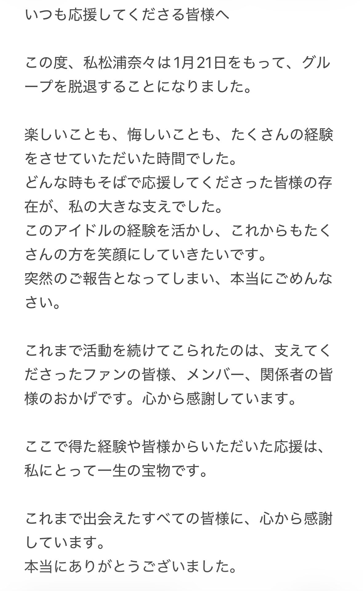 松浦さん本人もXで、「グループを脱退することになりました」と明かし、ファンに感謝を伝えていた。