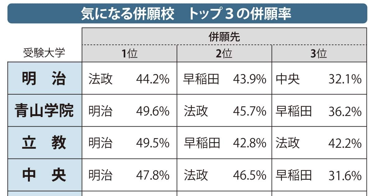 まず、明治大をみてみよう。併願先として最も選ばれているのは法政大で44・2%。次いで、早稲田大43・9%、中央大32・1%と続いた。