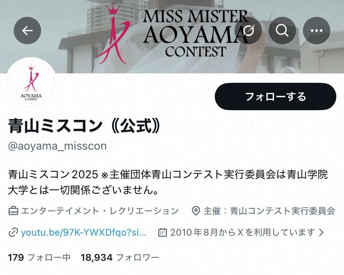 1/30(金) 9:23青山学院大学の学生を候補として開催されるキャンパスコンテスト「青山ミスコン」が公式Xを30日に更新。コンテストの名称を変更したことを伝えた。