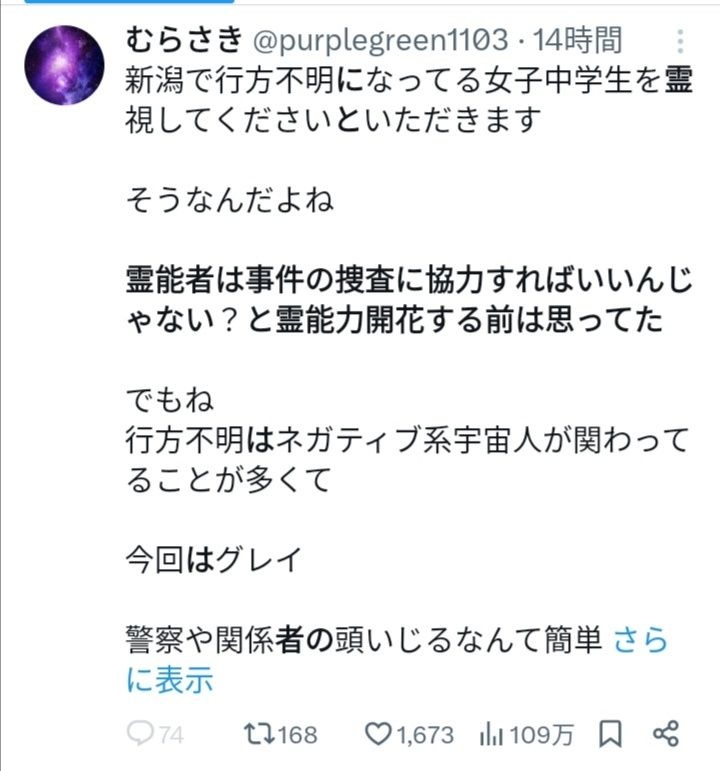 新潟で行方不明になってる女子中学生を霊視してくださいといただきます