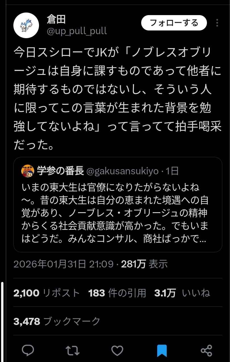 倉田 (@up_pull_pull) on X今日スシローでJKが「ノブレスオブリージュは自身に課すものであって他者に期待するものではないし、そういう人に限ってこの言葉が生まれた背景を勉強してないよね」って言ってて拍手喝采だった。x.com- 4 : 2026/02/02(月) 00:43:31.55 ID:exQuvrep0