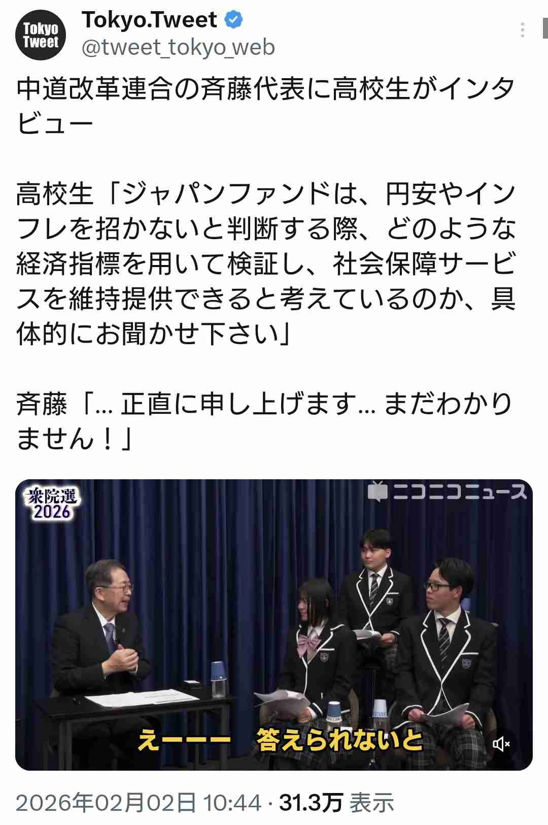 高校生「ジャパンファンドの運用資産で財源十分に賄えるのですか?」→斉藤氏「わかりません」