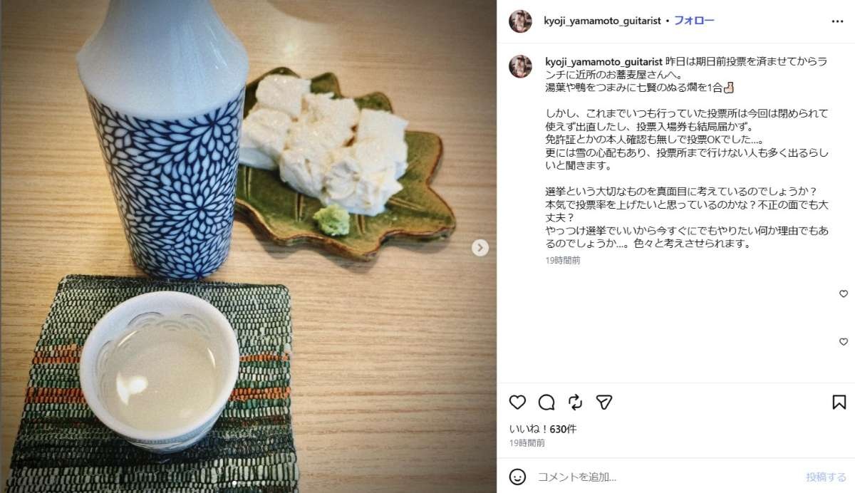 山本は「昨日は期日前投票を済ませてからランチに近所のお蕎麦屋さんへ。湯葉や鴨をつまみに七賢のぬる燗を1合」と記し、ソバやお酒の写真などを公開した。
