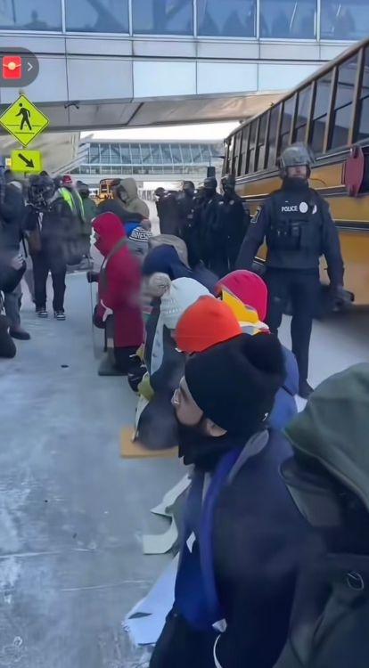 約100人の抗議参加者は、まるで餃子のように体を包み込み、胸や背中には「ICEを止めろ」と書かれたプラカードを掲げていた。彼らは凍った道路の上に一斉にひざまずき、一歩一歩前進し、幹線道路を完全に遮断して救急車さえも通行できないようにした。