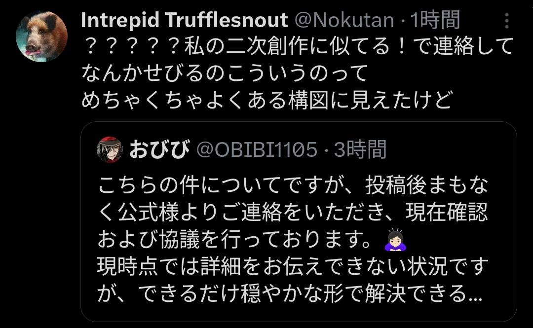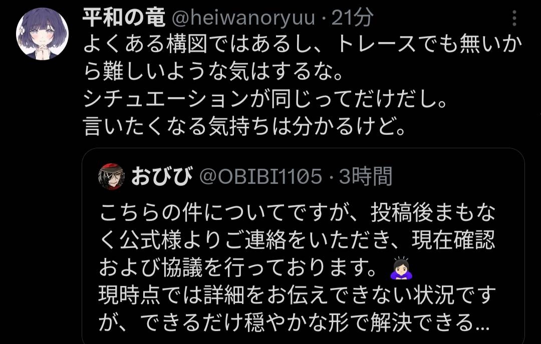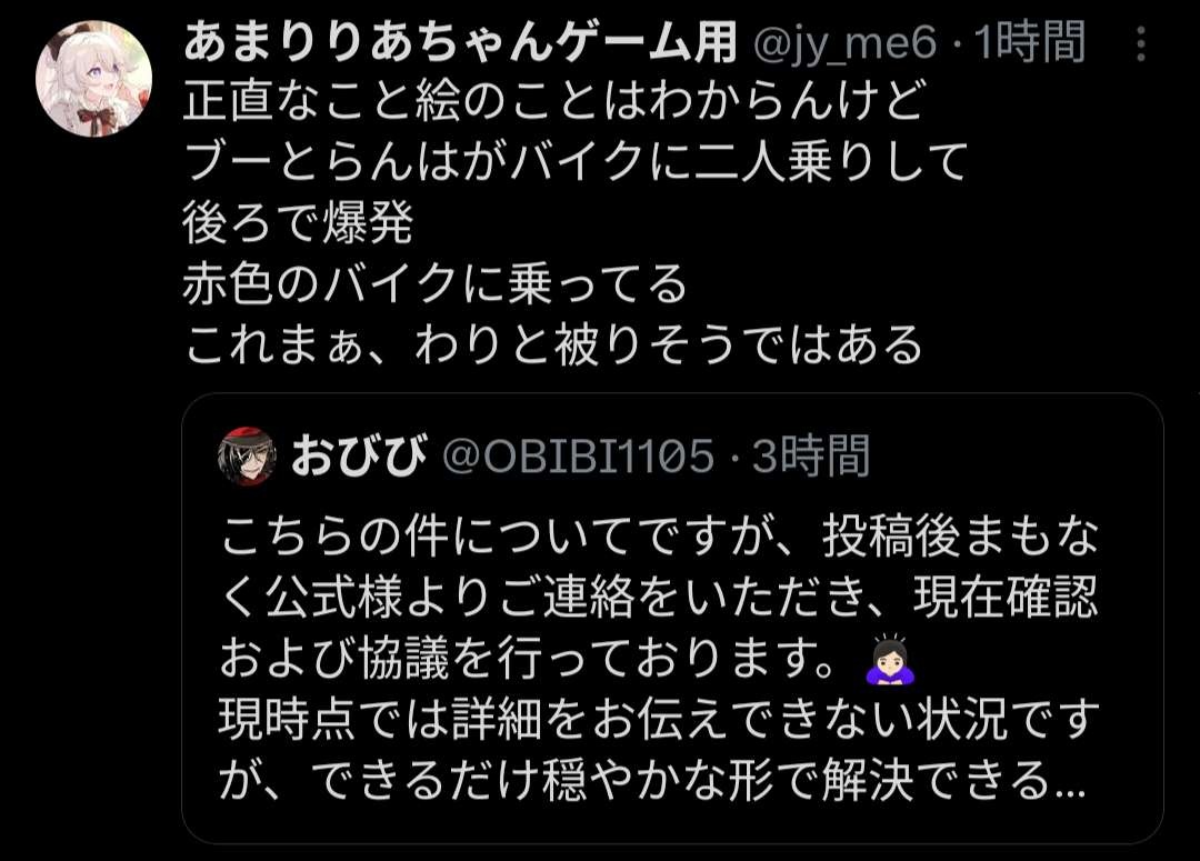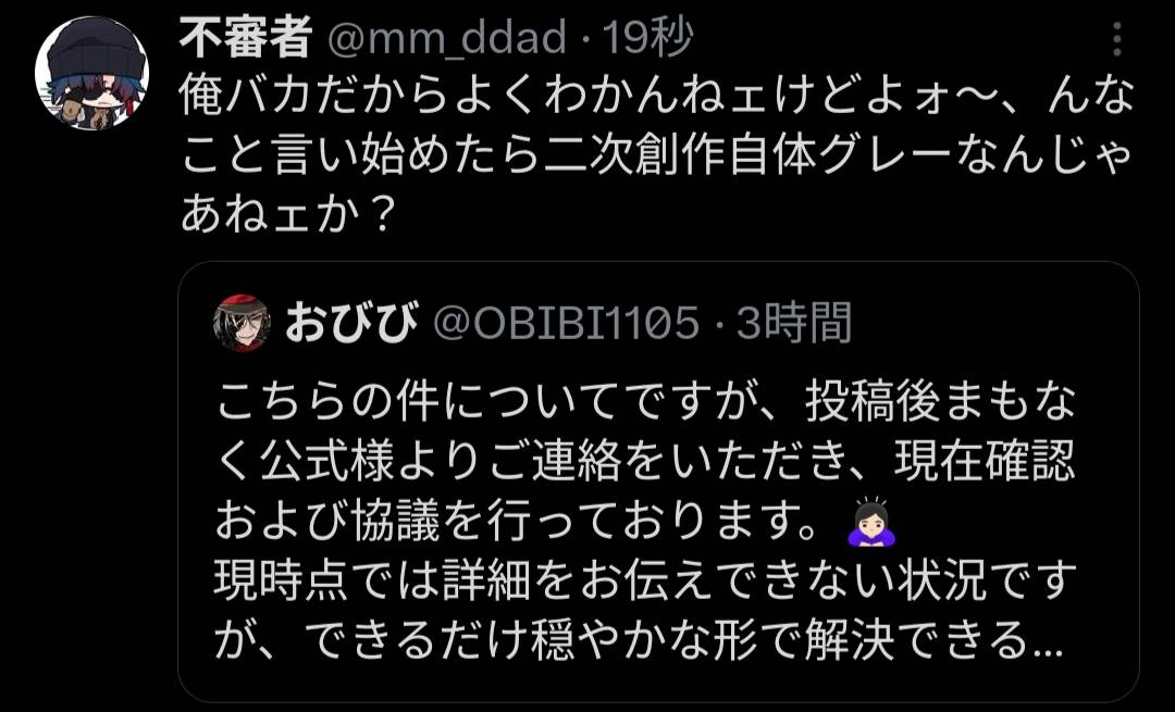 - 公式から連絡あって協議中みたいだから札束で解決して終わりそうだな