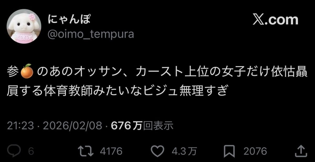 女さん「オレンジの政党のおじさん、カースト上位のJKにえこひいきする体育教師のビジュ」