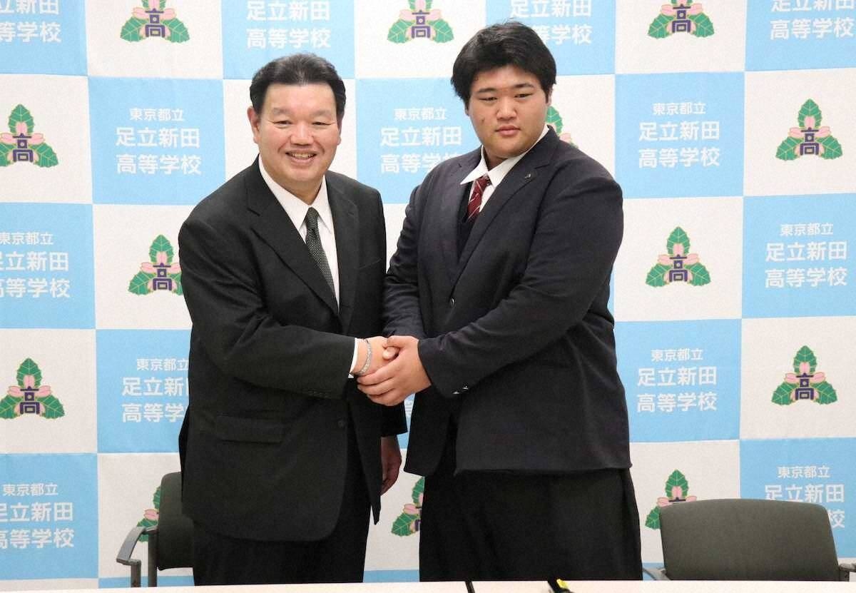 目標も大きく「横綱になりたい」と意気込んだ。東京・足立新田高で会見する甲斐田(右)と春日野親方(撮影・中村 和也)