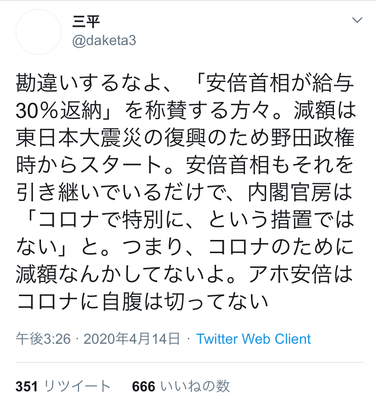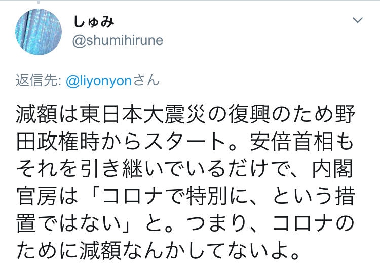 コロナのために減額した訳ではないが、震災後安倍も引き続き減額してたってのはになぜかニュースにならなかったらしいな - 191 : 2020/04/14(火) 21:58:19.62 ID:CwfgHRJI0
