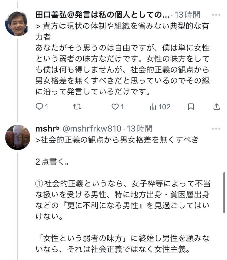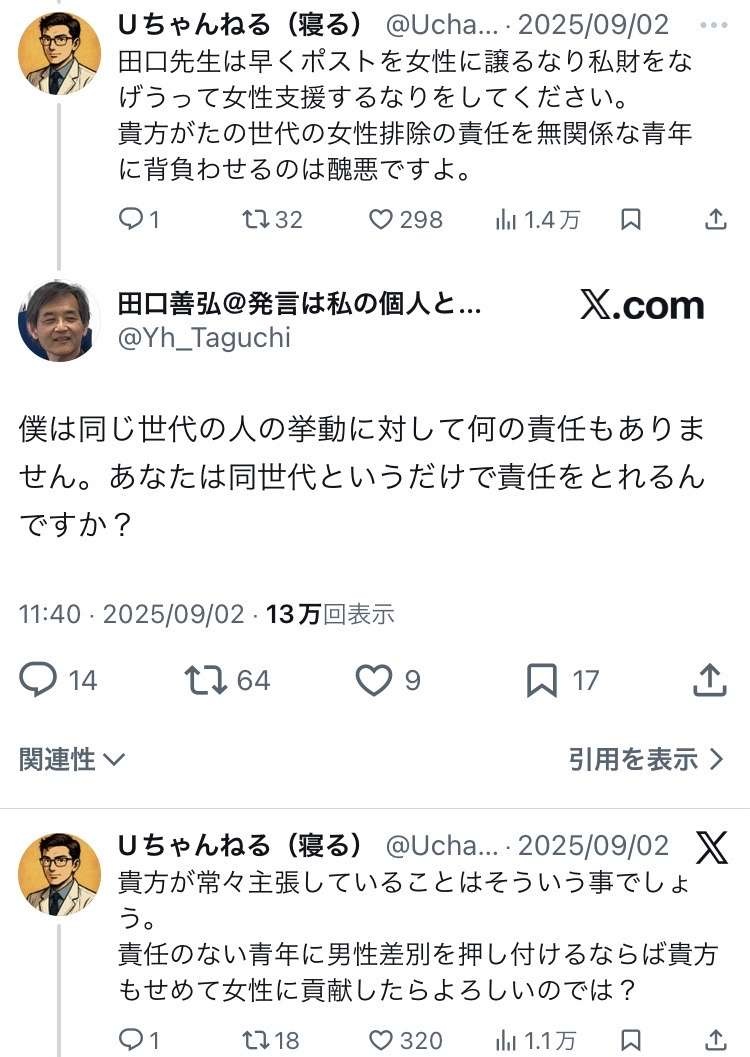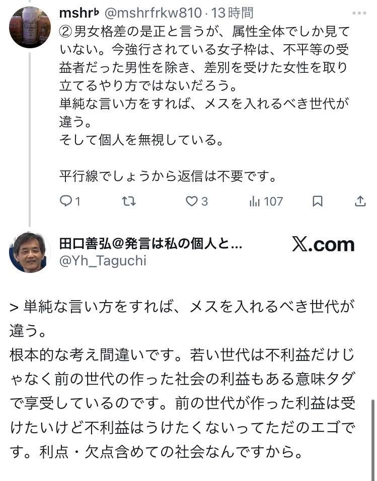 「世代が同じってだけで僕と女性排除していた人を同一グループ扱いするのは気持ち悪い」らしい