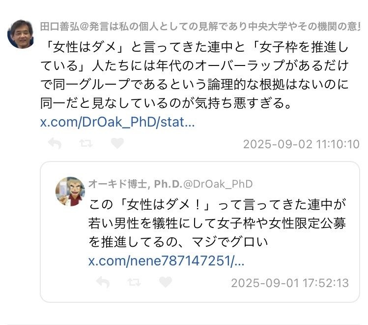 中央大教授「女子枠に反対する若い男子学生はただのエゴ。彼らには不利益を受ける責任がある」