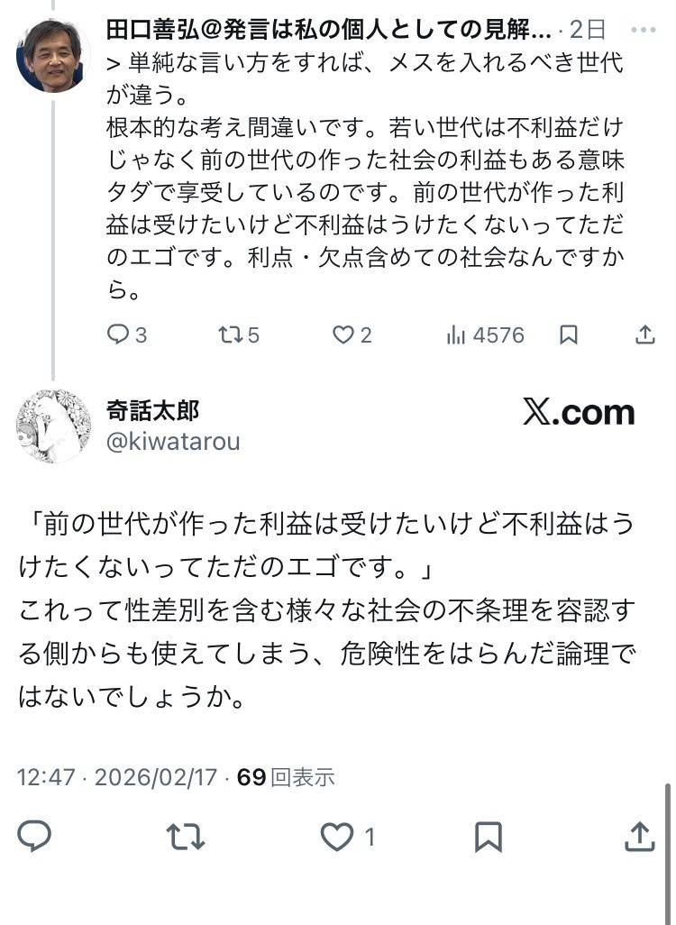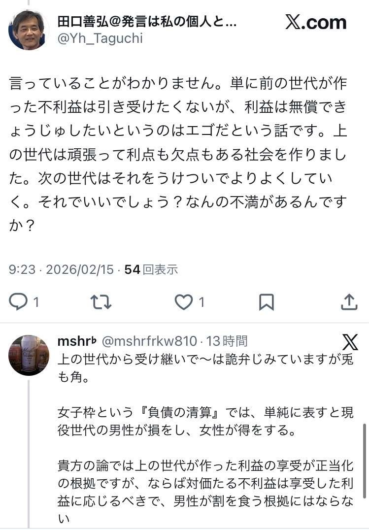 腹立つのはてめぇらが美味い汁啜ってきたツケを若い男子に押し付けてその上悪びれずお前らにはその責任があるとか言っちゃう態度 - 34 : 2026/02/18(水) 08:42:30.80 ID:OImGr1Uz0