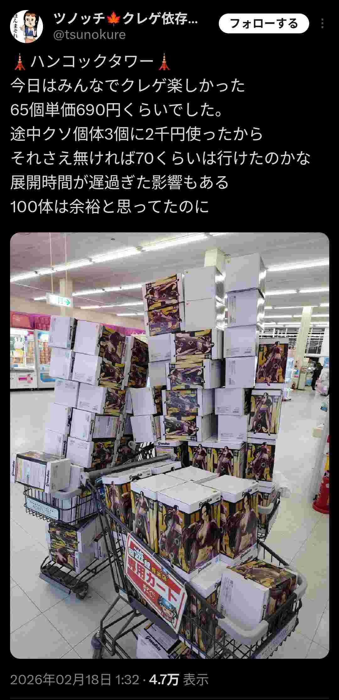 クレーンゲーマーさん、1人で同じフィギュアを65個取り大炎上www