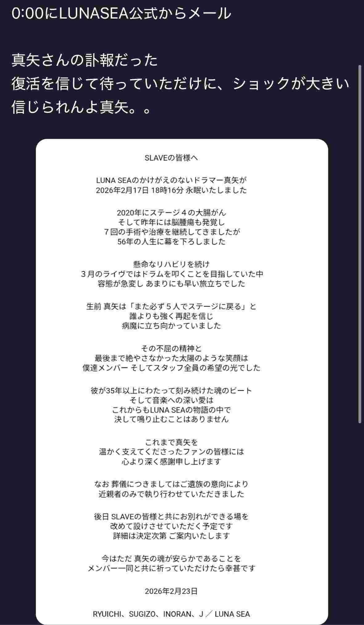 LUNA SEAのかけがえのないドラマー 真矢が、2026年2月17日 18時16分 永眠いたしました。