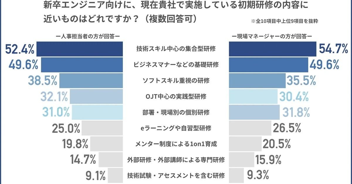 キャリア教育や人材開発支援を提供するリアセックは2026年1月19日、「新卒エンジニア育成」に関する調査結果を発表した。IT企業で新卒エンジニアの育成を担当している人事担当者および現場マネジャー863人を対象に、エンジニア育成の実態を調査したものだ。新卒エンジニア向けの初期研修については技術スキルの習得が中心となっており、その内容について一定の満足度がある一方で、現場配属後は「ソフトスキル(主体性・論理性・協調性など)」の不足が課題に挙がる実態が浮き彫りとなった。