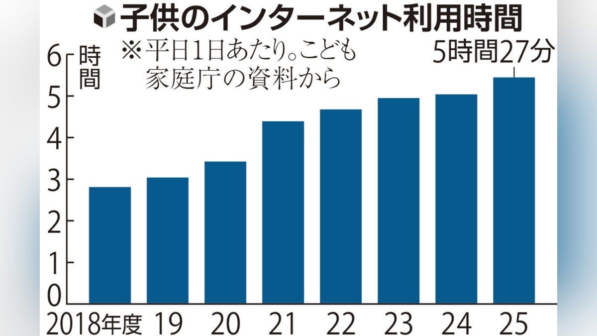 2026/02/27 05:00小中高校生のインターネットの利用時間が平日の1日平均で5時間27分だったことが、こども家庭庁の調査でわかった。