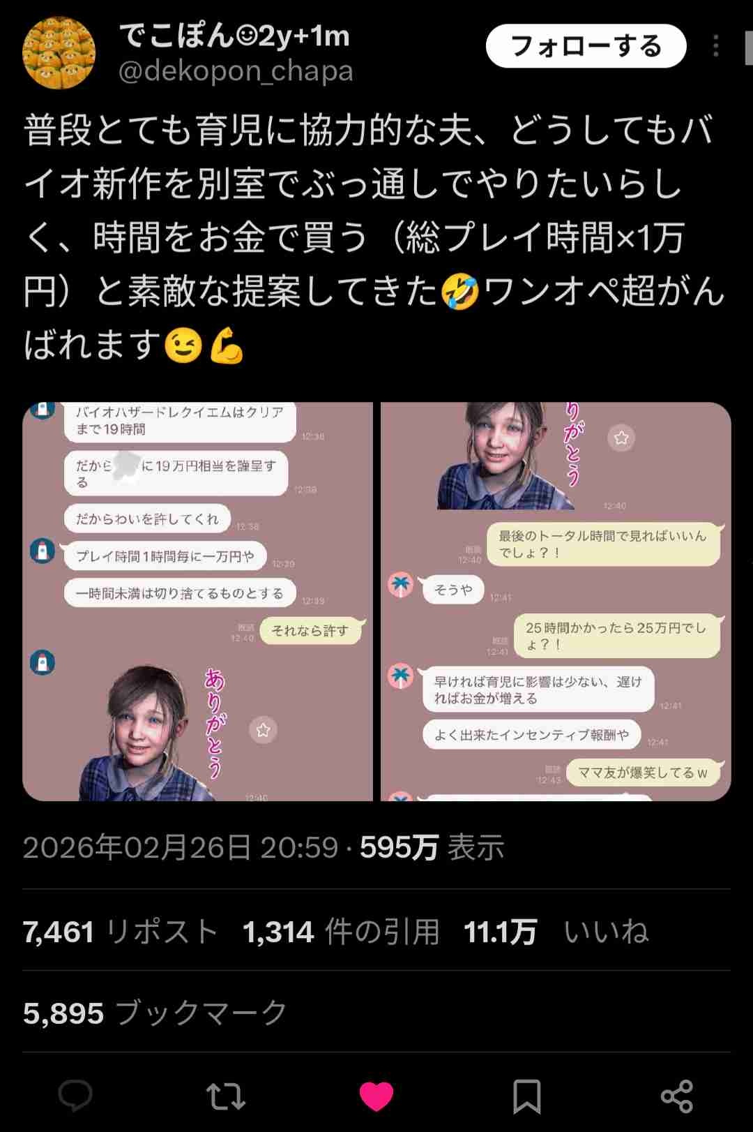 夫さん、嫁に20万円を支払うことによってバイオハザード新作のプレイ許可を得ることに成功!