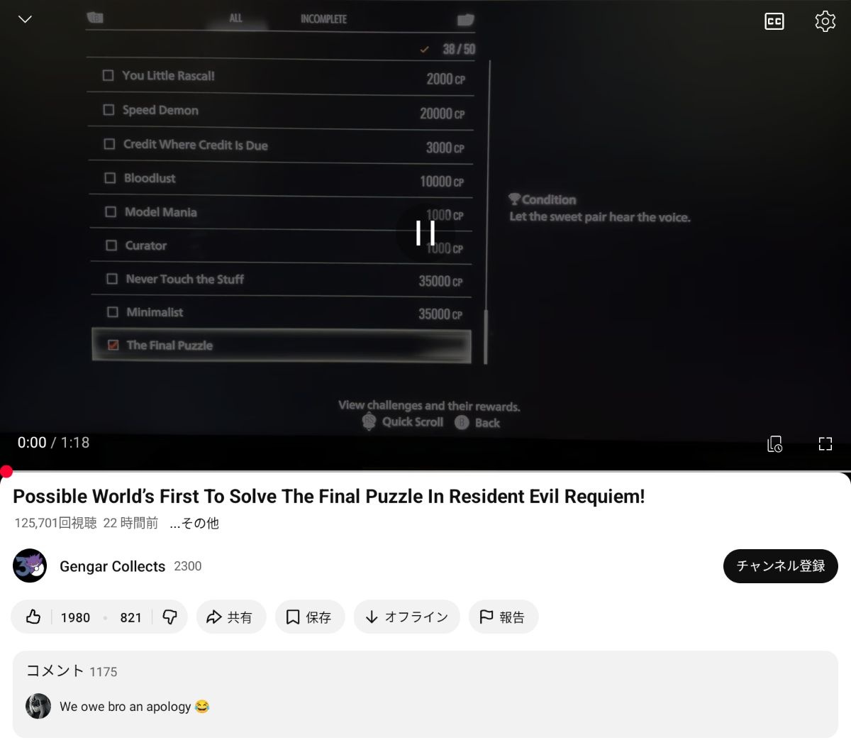 突然趣味のポケモンカードを紹介するだけのチャンネルのおっさんが「バイオ9で謎の人形をゲットして何これ?最後の実績も解放されたけど」みたいな動画を出す