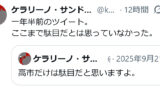 ケラリーノ・サンドロヴィッチは高市氏が立候補した自民党総裁選前月の昨年9月、自身のXで投稿した「高市だけは駄目だと思いますよ」というポストを添付。