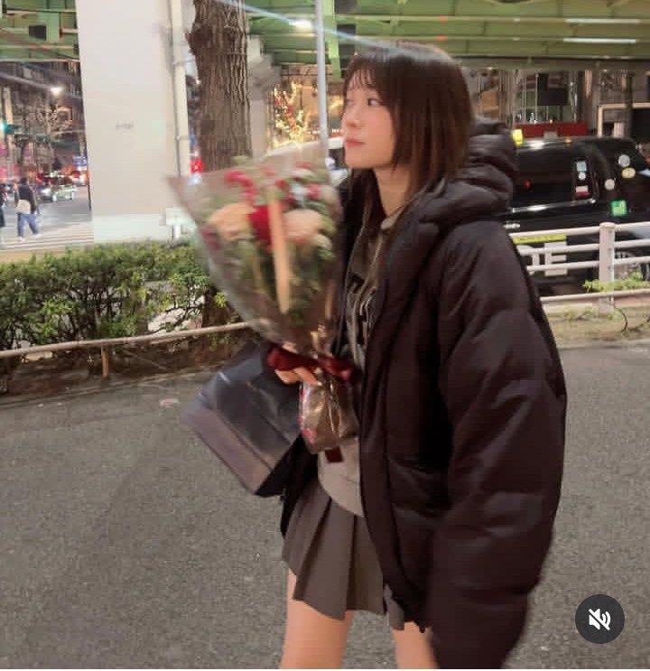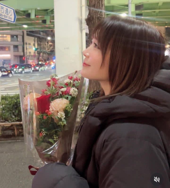 黒のダウンジャケットに、ミニ丈スカート、ハイソックスのコーディネートを披露。花束を持ち、笑顔を見せる姿を複数枚公開した。