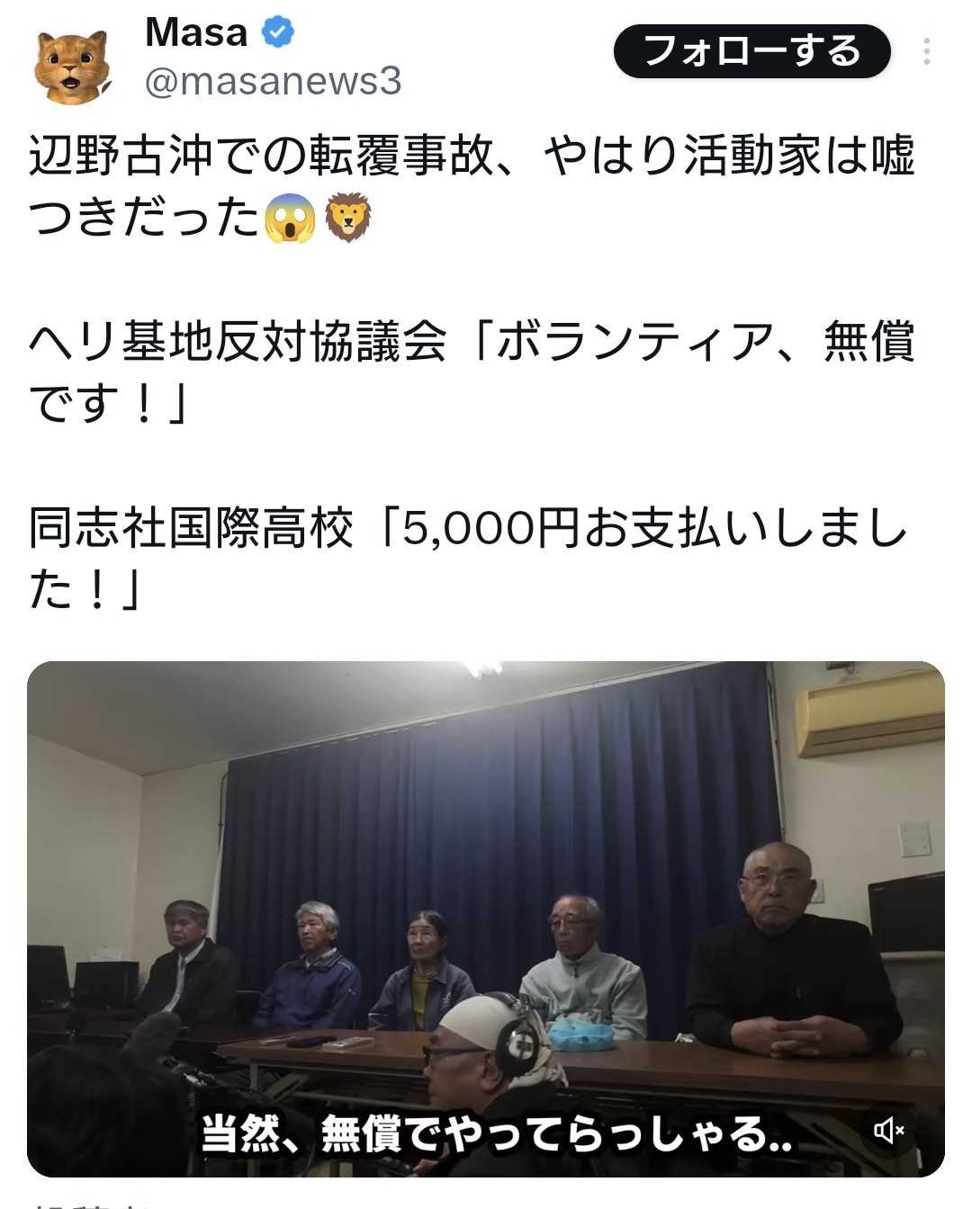 ヘリ基地反対協議会「ボランティア、無償です」→同志社国際高校「5,000円✕3お支払いしました」