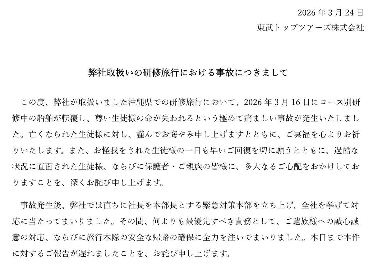 東武トップツアーズは3月24日、Webサイトにて「弊社取り扱いの研修旅行における事故につきまして」と題したお詫び文を掲載した。