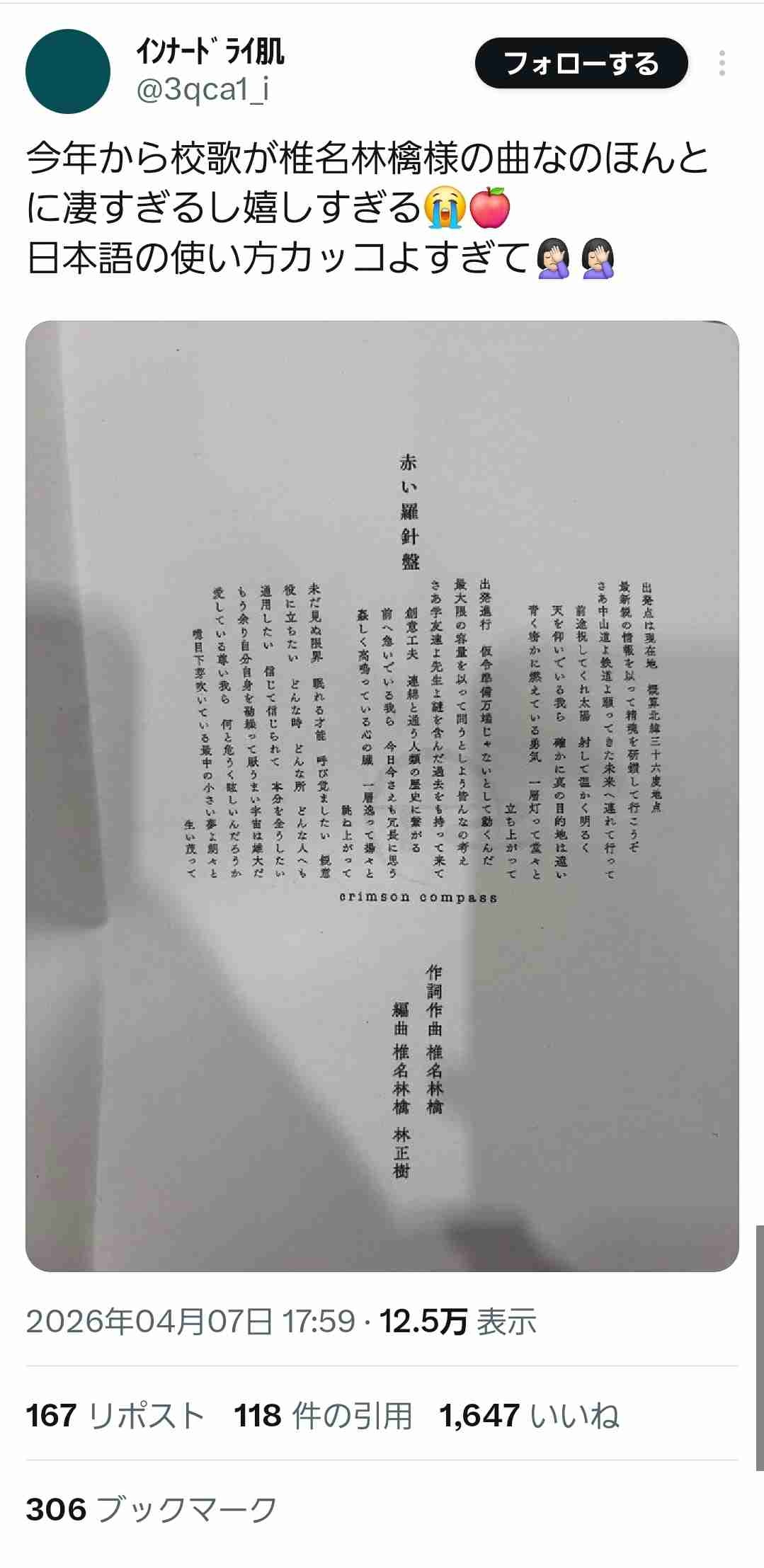 今年から校歌が椎名林檎様の曲なのほんとに凄すぎるし嬉しすぎる😭🍎