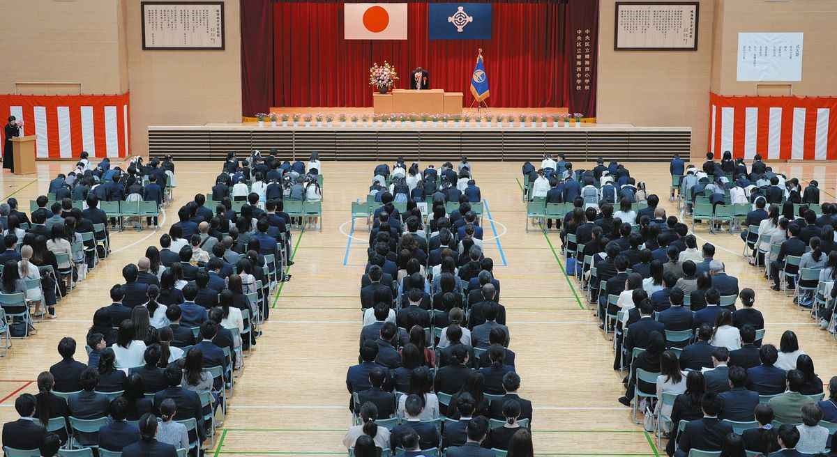 晴海フラッグにある区立晴海西小学校で8日、入学式が開かれた。新1年生だけで283人の大所帯。式典は9学級を分け、午前と午後の2部制で行われた。