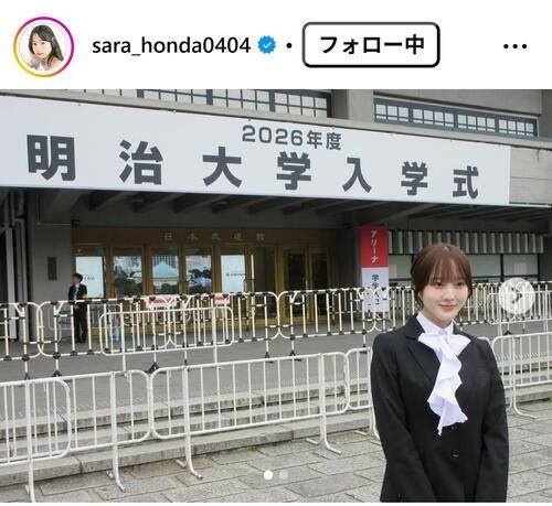 「大学に進学しました。充実した大学生活にしていきます」とつづり、会場となった東京・日本武道館の前で撮影した写真をアップ。「2026年度 明治大学入学式」と書かれた看板をバックに、スーツ姿で笑みを浮かべている。本田は3月に明大付属八王子高校を卒業したことを明かしていた。