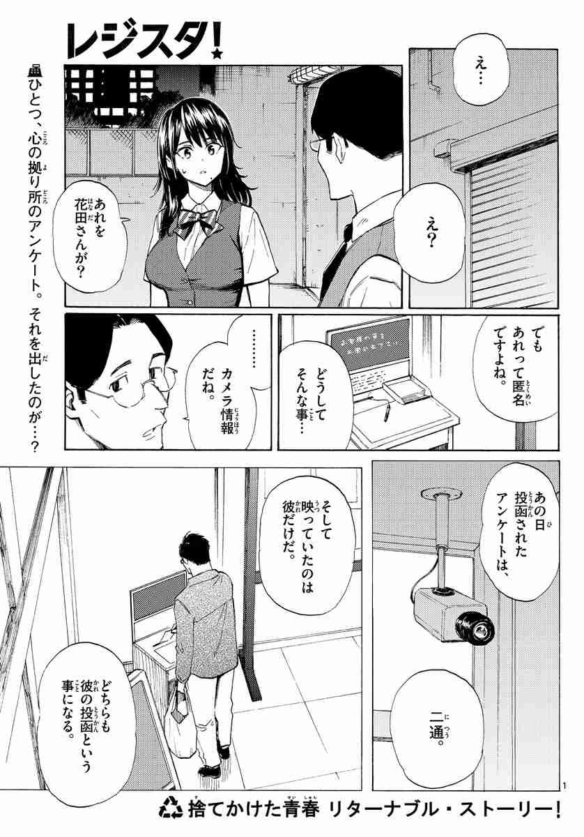 『レジスタ!』は、第1巻発売時のコミックナタリーによると『過去の経験から人を好きになることを諦めていた、ラブソングが苦手なフリーの作詞家・花田和己。引っ越してきた町のスーパーマーケットのレジで、1人の女性と出会う。人を好きにならないと決めた人と、未だ人を好きになることを知らない人の関係を描く』というお話。