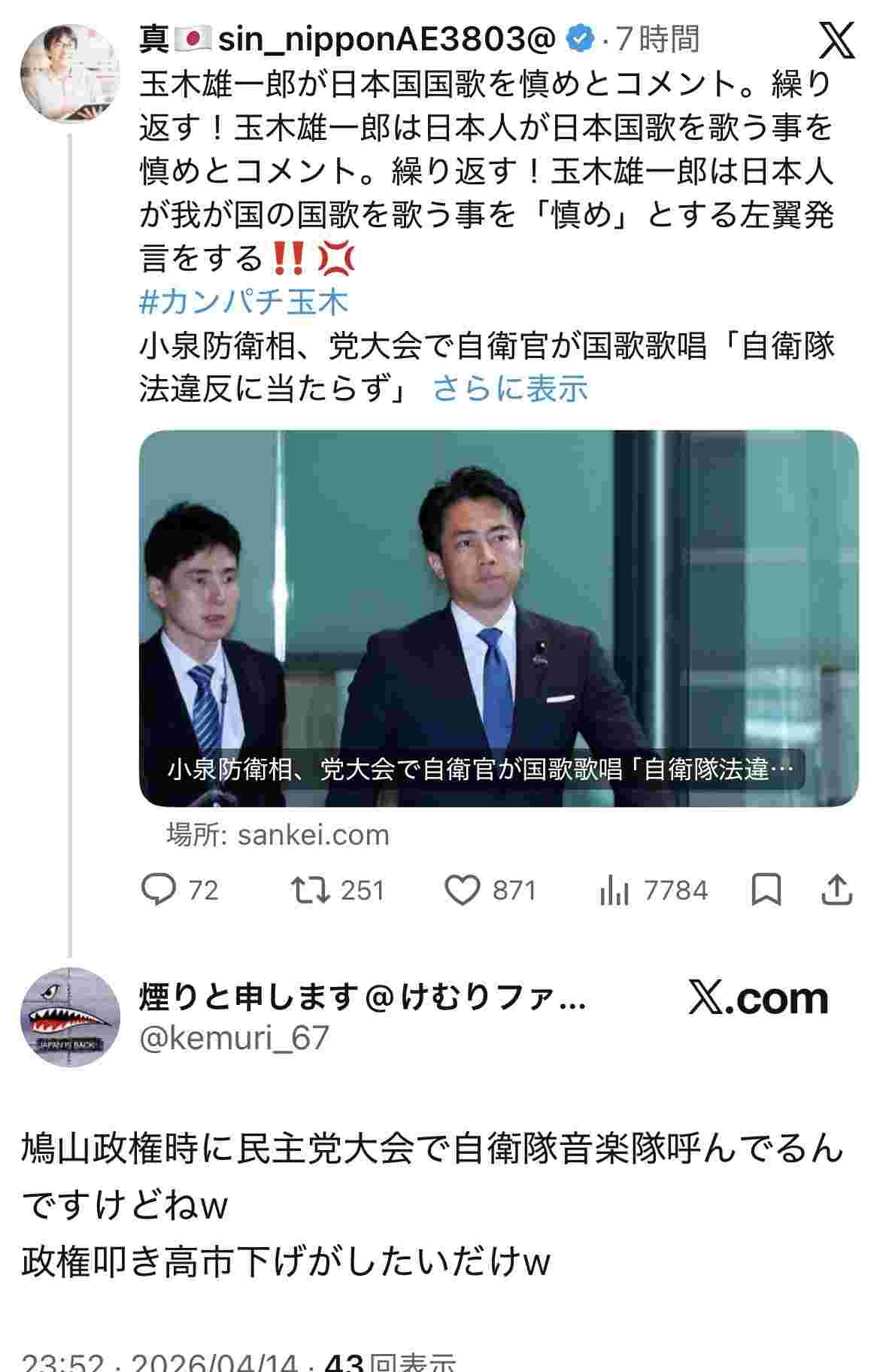 他国なら普通のこととか言って自衛隊を国軍にしたいんだろ - 13 : 2026/04/15(水) 19:41:30.32 ID:Y+ENuE33a