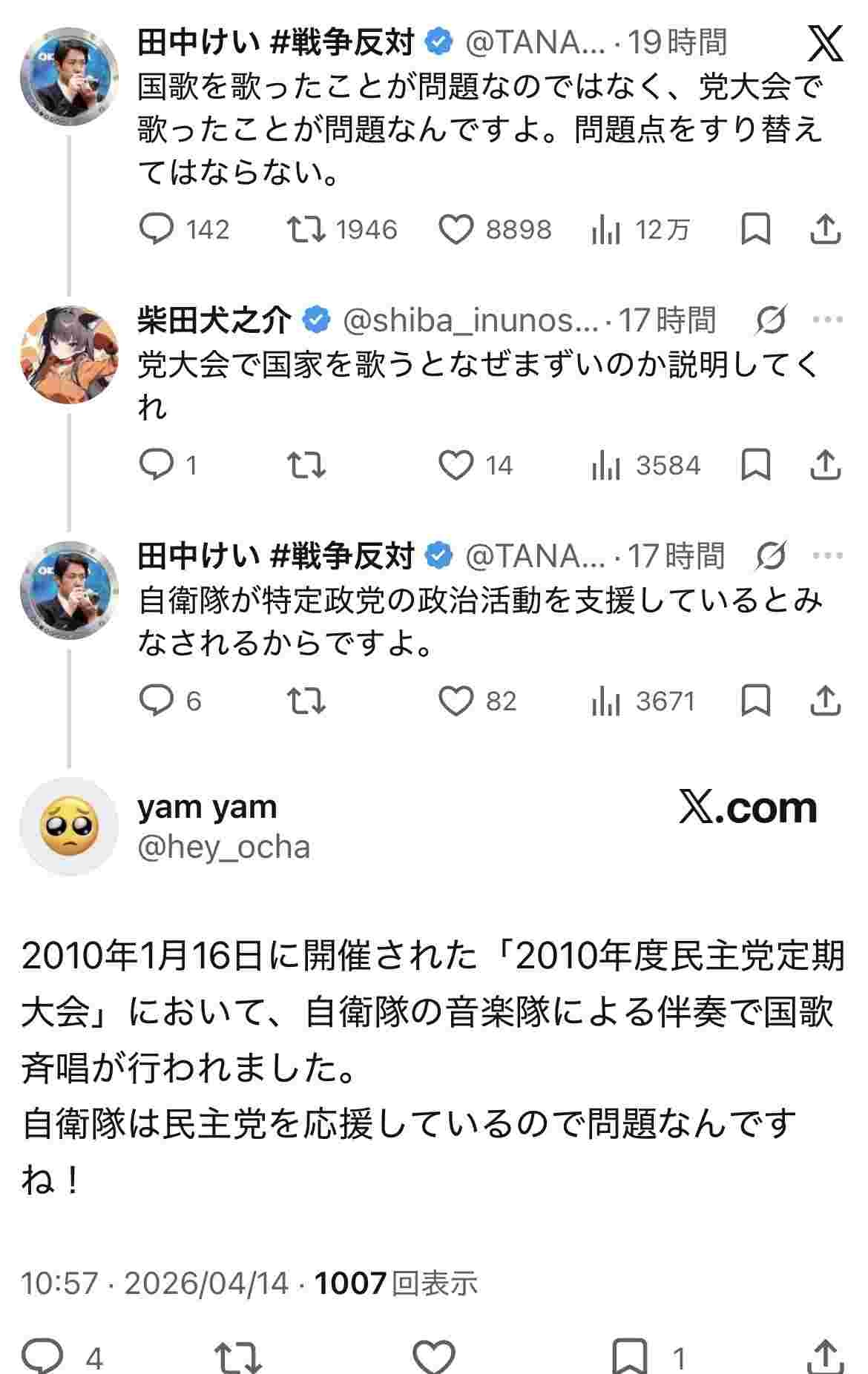 結論から申し上げますと、過去の民主党(および現在の国民民主党や立憲民主党)の党大会で、自衛官や音楽隊を呼んで歌わせたという確かな記録や客観的な事実は見当たりません。