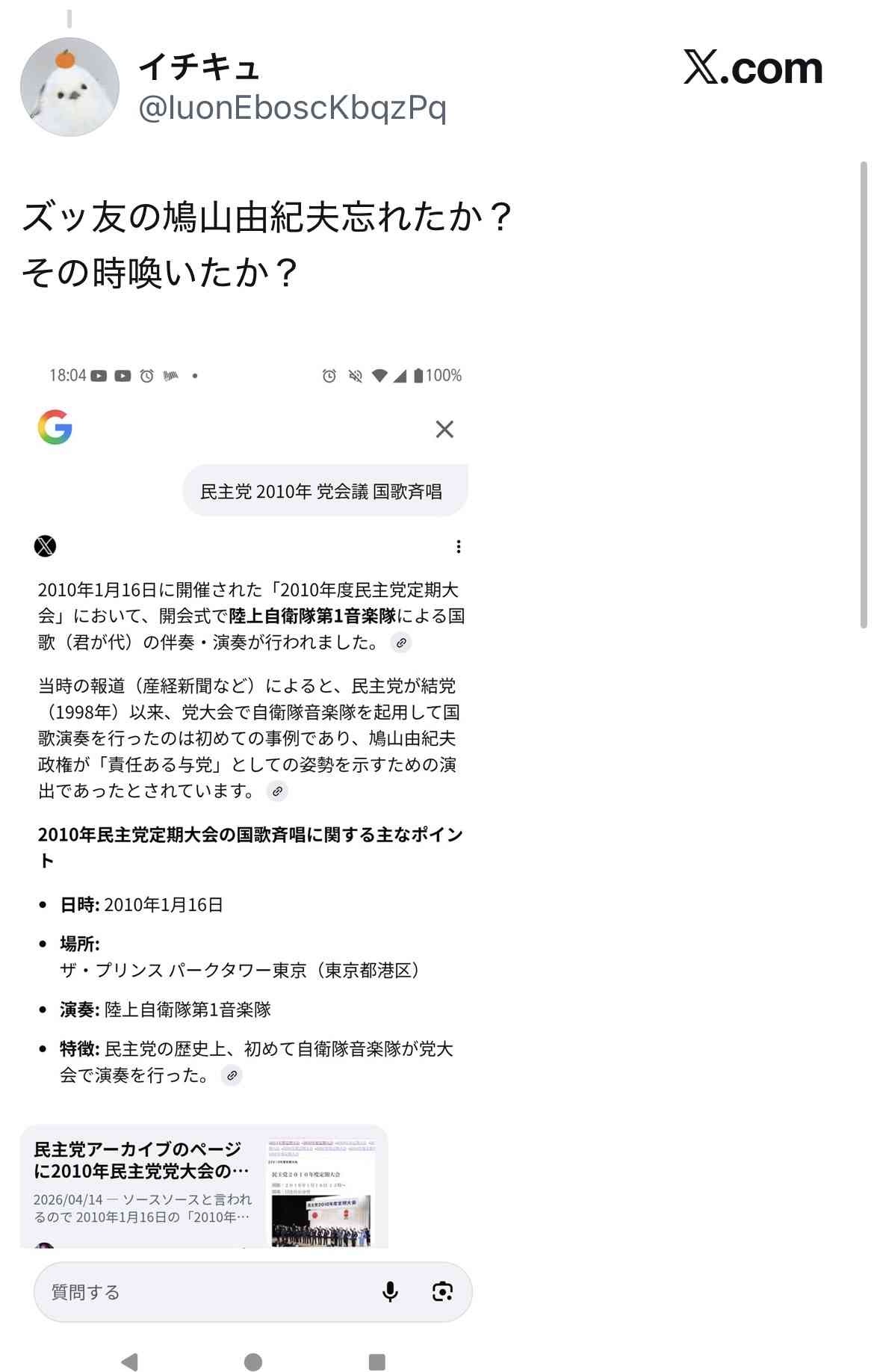 - ワイいまGeminiに『民主党 2010年 党会議 国歌斉唱』で聞いてみたら全く真逆に2010年(平成22年)1月16日に開催された旧民主党の第15回定期大会において、国歌斉唱が行われなかったことが当時大きな議論を呼びました。と回答されたんやがどういうことや