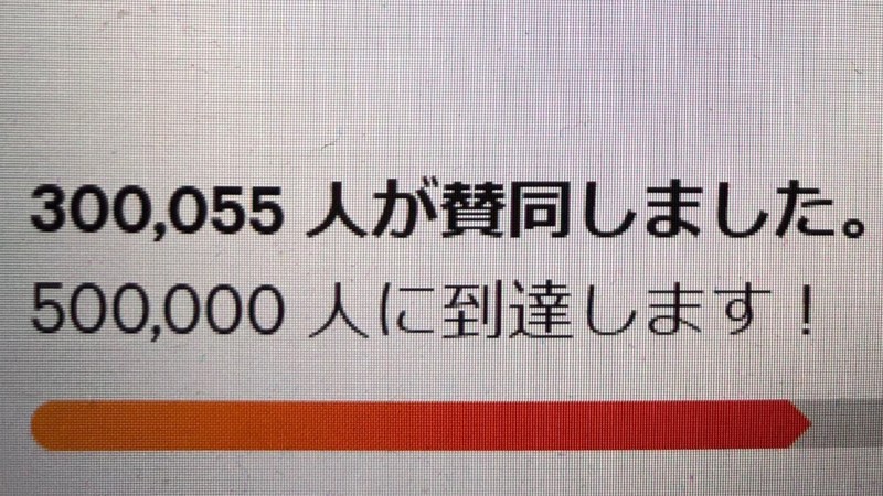 その呼びかけに賛同者が殺到。開始から2日足らずで15万人を突破した。これは、あまたの賛同者募集を扱っているChange.orgの日本で行われたキャンペーン・署名で、これまでで最も多く最も速かった。その後も賛同者は増え続け、きょう17日朝9時前にあと1人の29万9999人に到達。9時過ぎに30万人を突破した。呼びかけ開始からわずか22日間での達成だ。