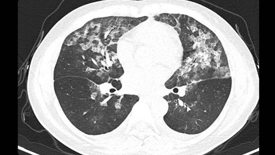 新型コロナウィルスへの警戒が続く中、病院はCTスキャンによる検査を行ったところ、患者の肺からすりガラス状の白い影が見つかった。